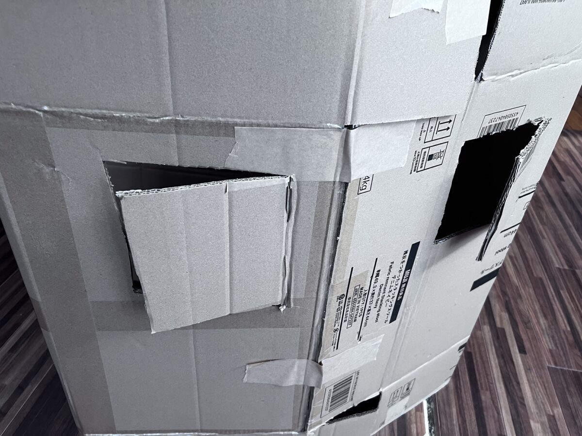 ただカッターで開けただけじゃ指が挟まるので、窓の大きさを1cmくらいカット。持ち手とか穴とか開けるのもめんどくさいので(飽きたら捨てるから頑張って作らない。)