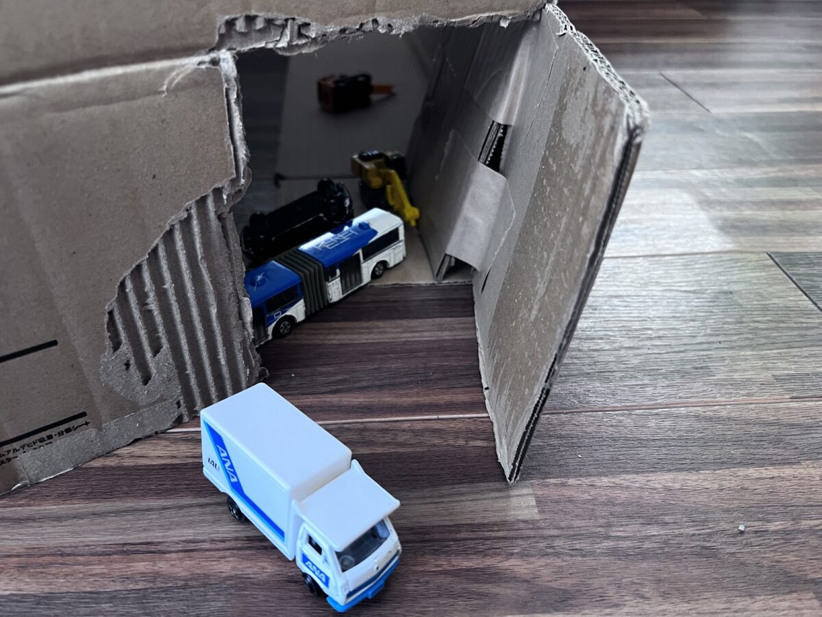 3歳末っ子、翌朝が古紙回収日だっていうのにダンボールを持ち出して一所懸命組み立ててました。