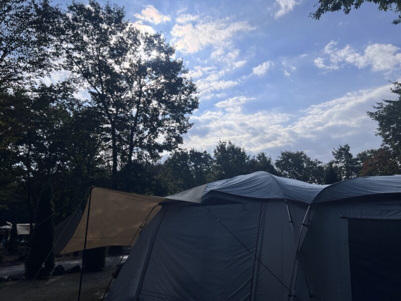 すがすがしい青空の下、真っ黄色のマスクをしてテントの前でホットサンドをかじる私。通り過ぎるキャンプ場の知らないお子さん…うちのテントの前を通るときに私に気付いて目を丸くしてました。笑